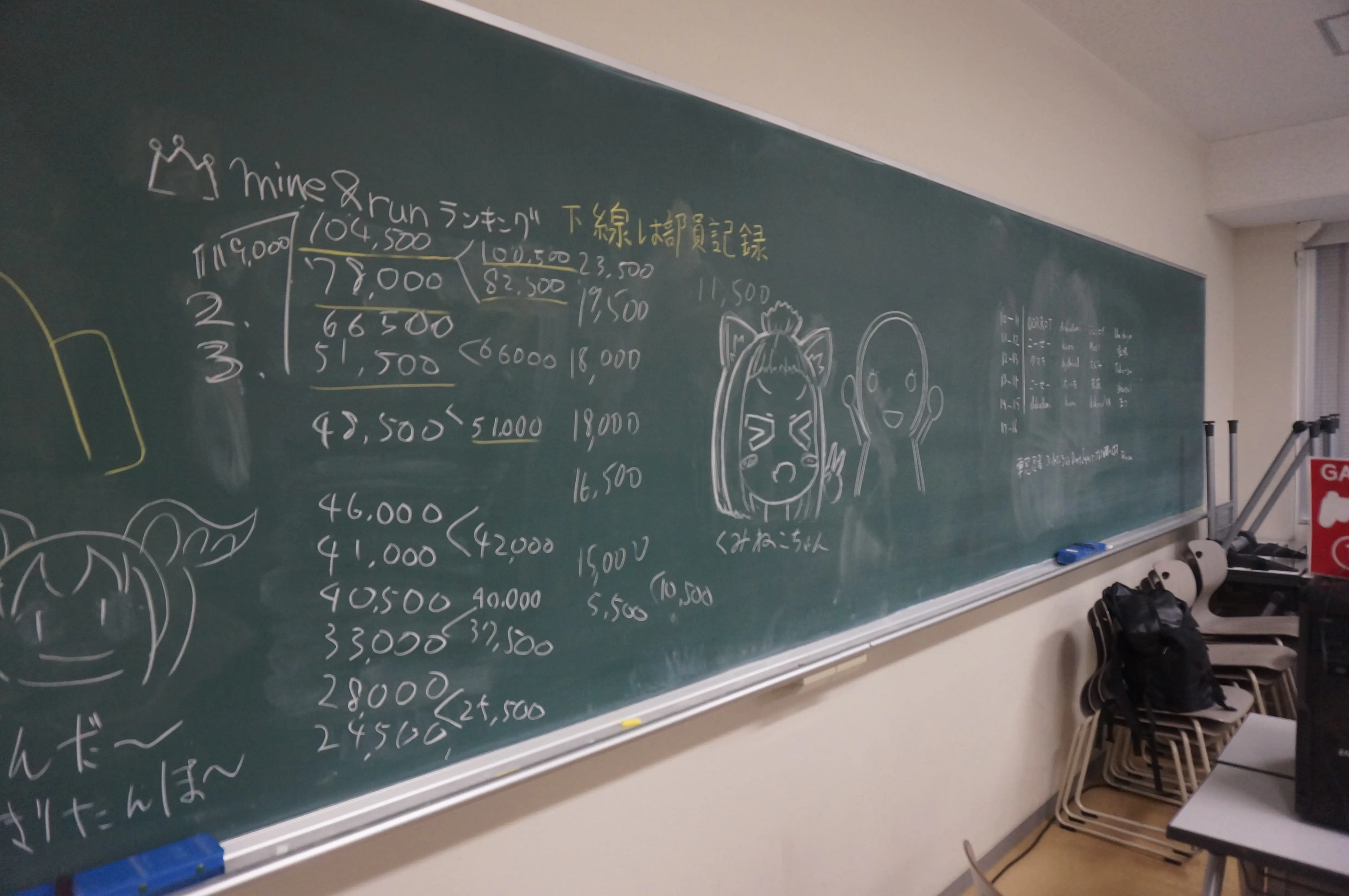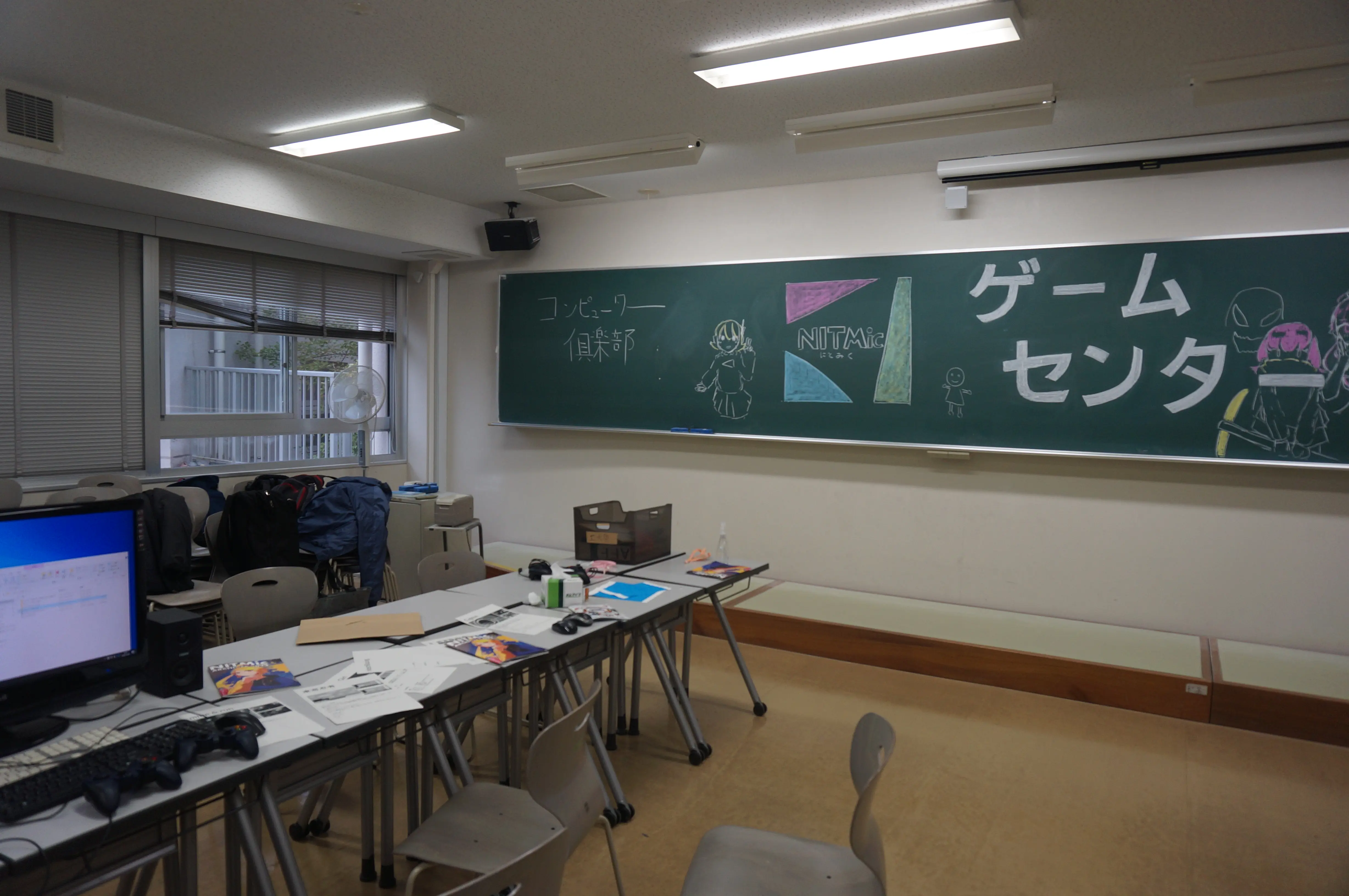 5221 講義室の様子です。部室から運ばれた 4 台の PC にて各種ゲームを来場者の方々にプレイして頂きました。特に音ゲー(cygnus)や mine&run のスコアアタックなども盛り上がりを見せておりました。 去年に比べて、お子様連れの来場者が多かったのも印象的でした(お子様連れ向けのゲームなども用意できると良かったですね)。