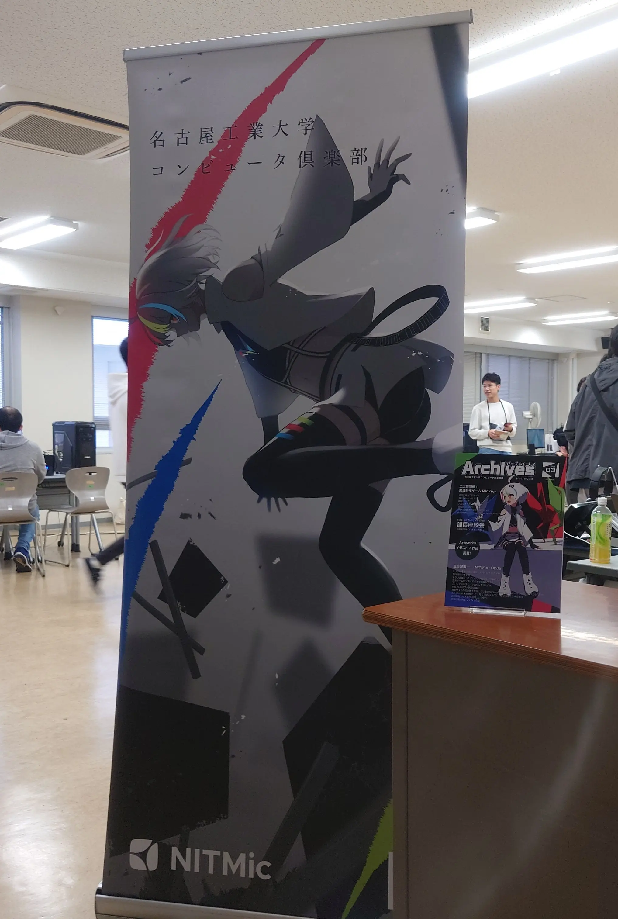 デカいですね。カッコいいですけれども、設置場所の関係で暗く映ってしまっています…。詳細は当サイトの記事NITMic 広報用ロールアップバナーを御覧ください。