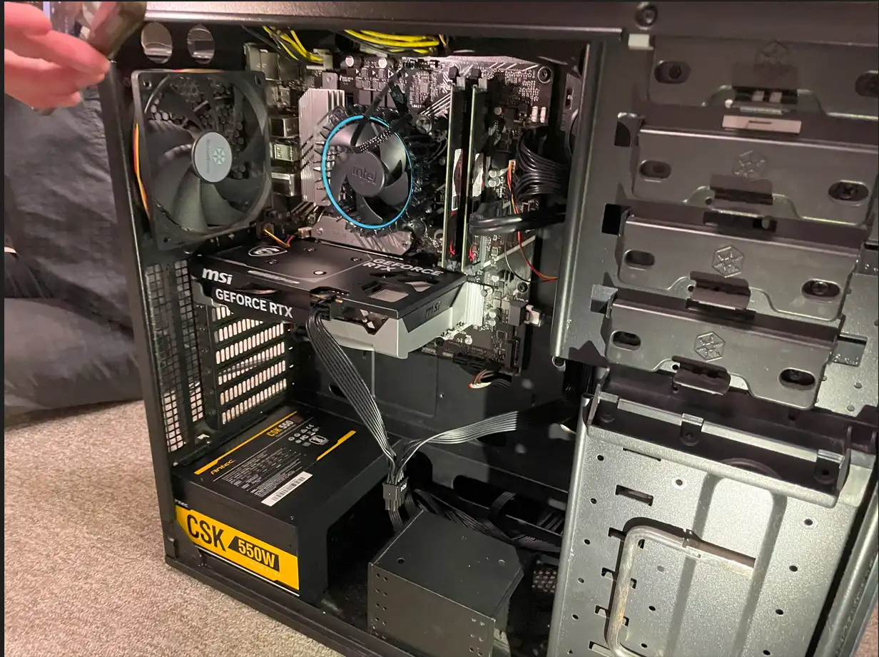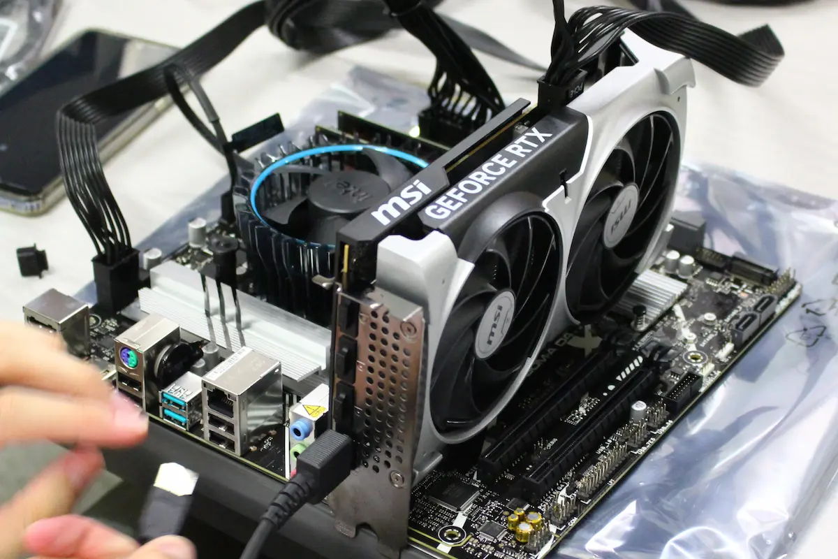 マザーボード、CPU、メモリ、GPU と、最低限のパーツだけ挿してから、電源を取り付け、起動確認を行う。自作 PC では必須の第一歩だ。