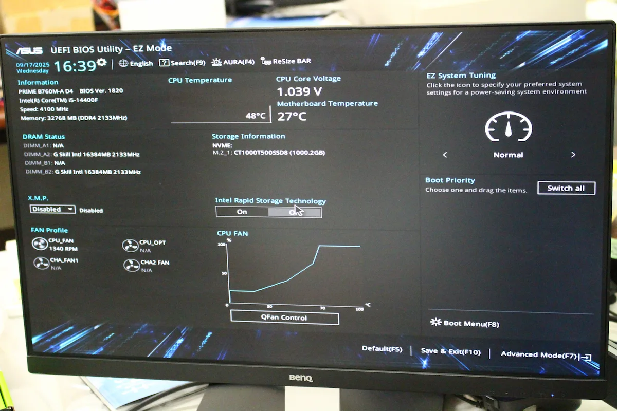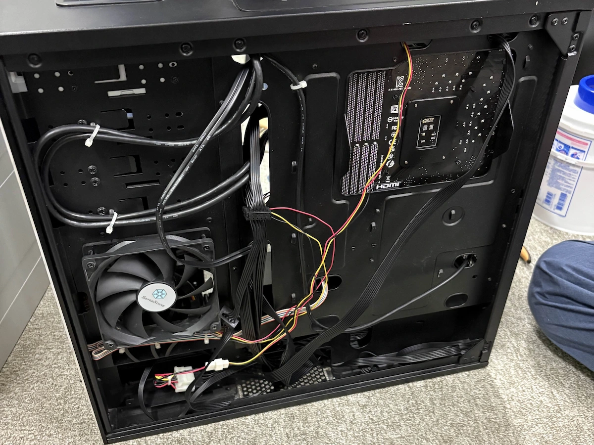クーラーの取り付けに苦戦したり GPU と CPU の補助電源の 8 ピン端子を間違えたりしながらも、といいつつもさほど時間もかからず、最小構成の起動確認を終えた。 筆者が初めて PC を自作したときはもっと苦戦していた覚えがある。皆、優秀である。