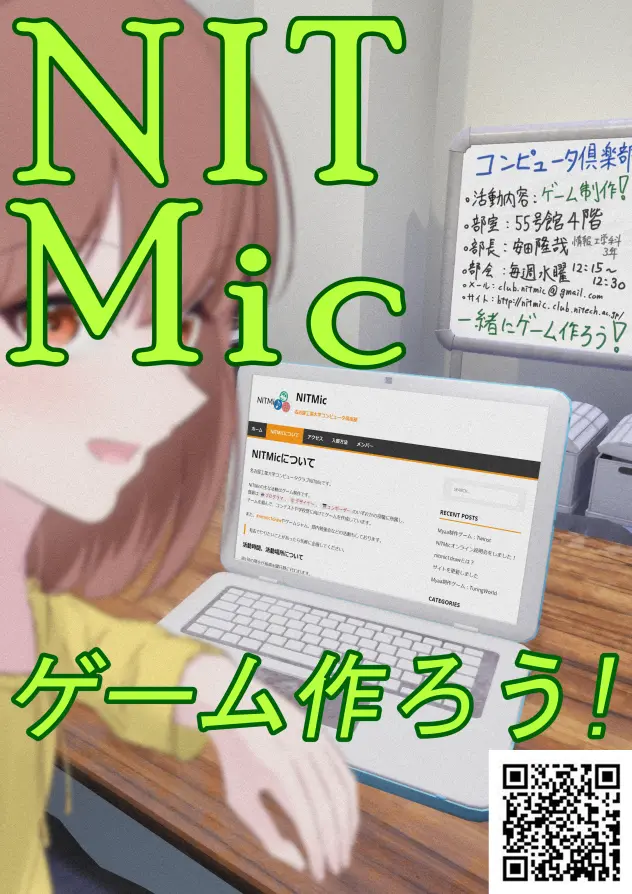 NITMic では新入部員の方を募集しております(上級生の方も歓迎です)。 ゲームが好きな方、ゲームを制作してみたい方、イラストや楽曲制作などのデジタルな創作活動に興味がある方、VR や Kinect に興味がある方、大学からデジタル創作を始めたい方、ご歓迎致します。