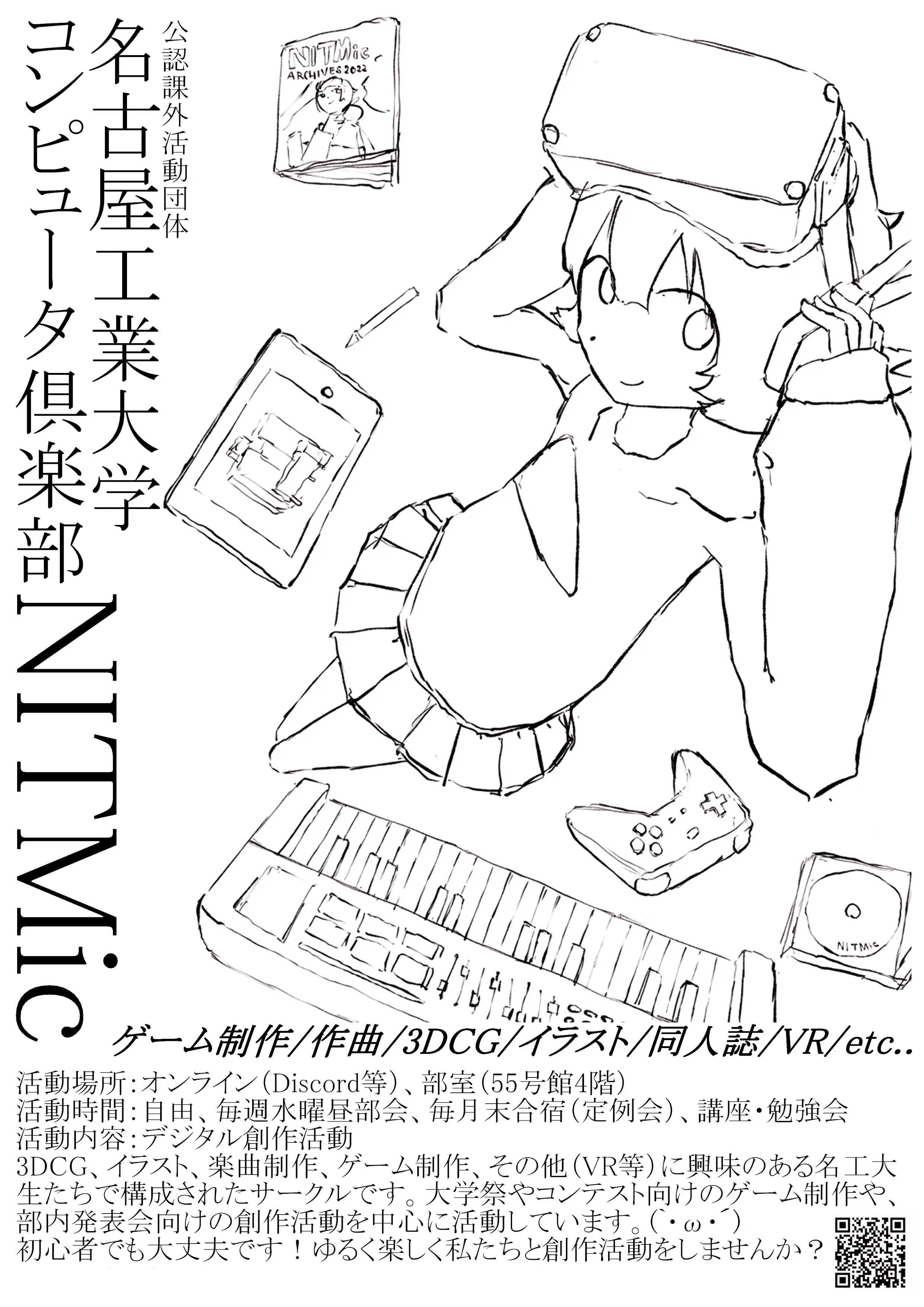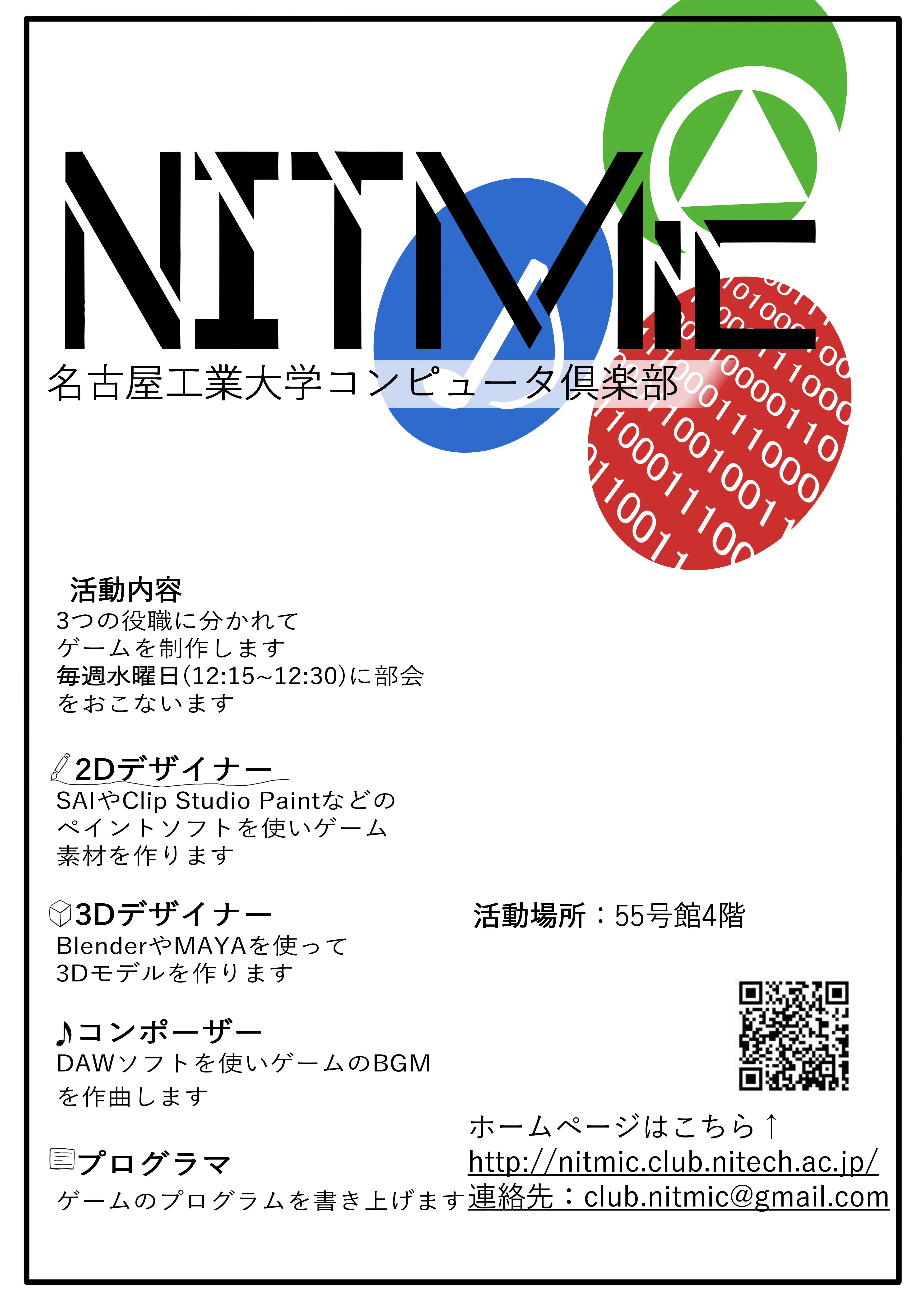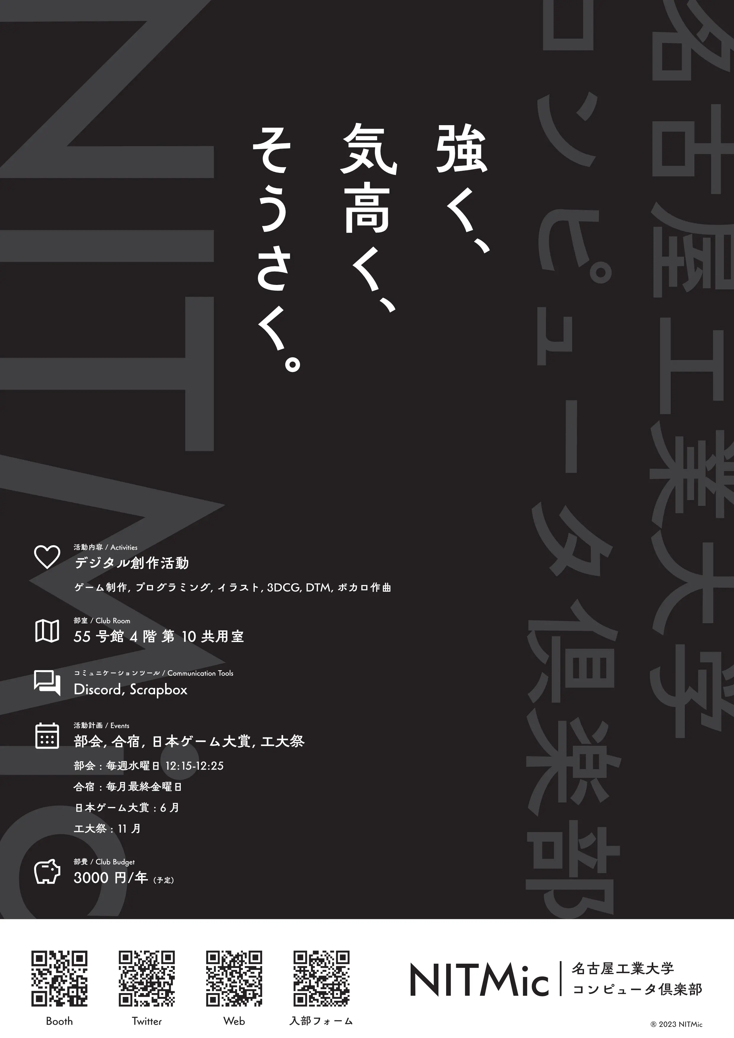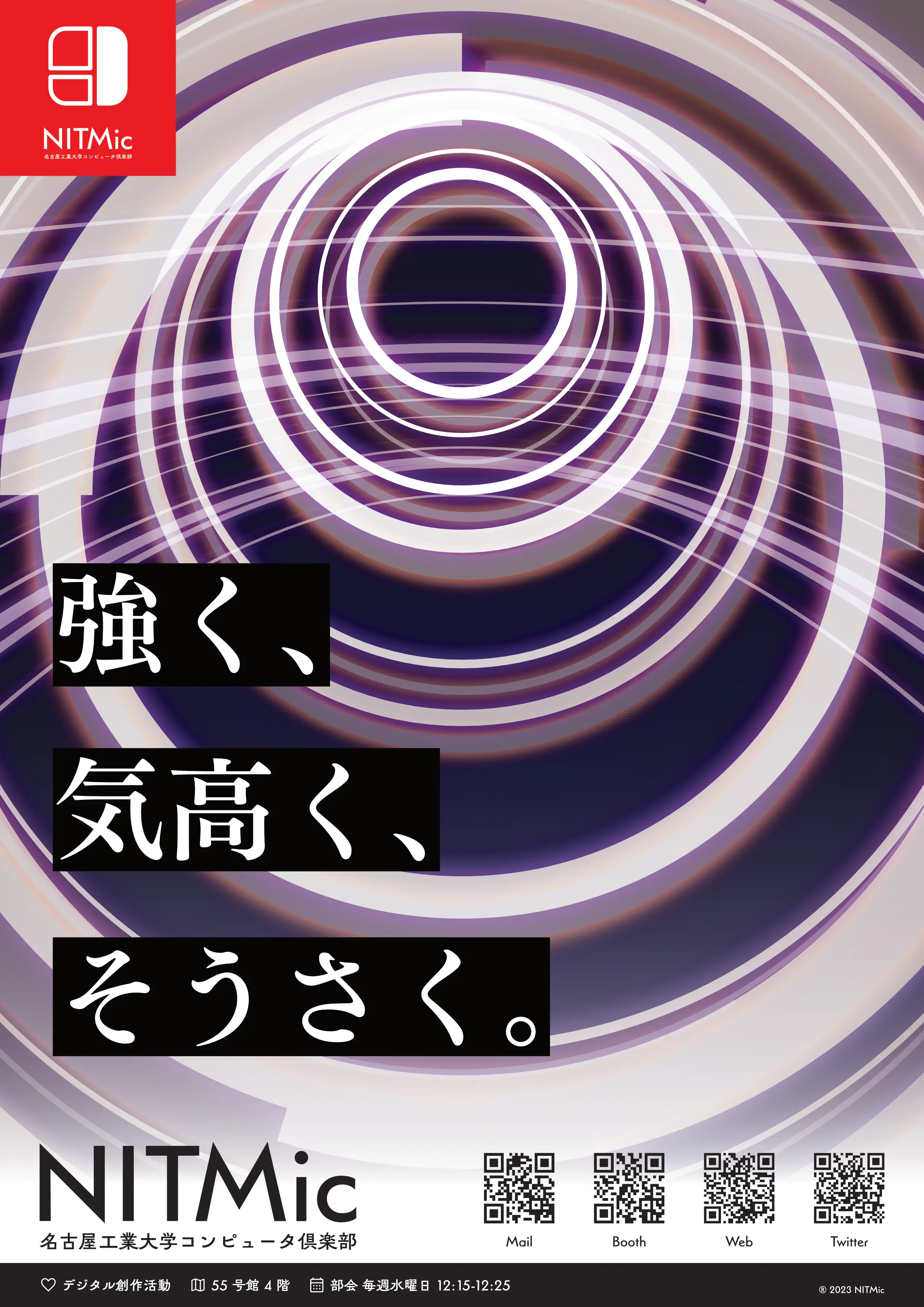 新歓ポスター 2023April 01, 2023 fjktkm作品紹介新歓ポスター今年度も新入生歓迎用のポスターを制作しました. ジュンセイ 作ポスター塩味 作ポスターfjktkm 作ポスター 1fjktkm 作ポスター 2Mass 作ポスターdokudami 作ポスターkuru 作ポスター 1kuru 作ポスター 2ポスターの一部は学内掲示板で公開していますので,ぜひご覧ください.活動にご興味のある方は,ぜひお気軽にお問い合わせください.新歓ビラ今年度から 3 年ぶり(?)となる新歓ビラも制作しました.dokudami 作ビラfjktkm 作ビラこちらも学内で配布しています.ご興味を持たれた方はぜひお気軽にお問い合わせください. fjktkm dokudami ジュンセイ kuru Mass 塩味
