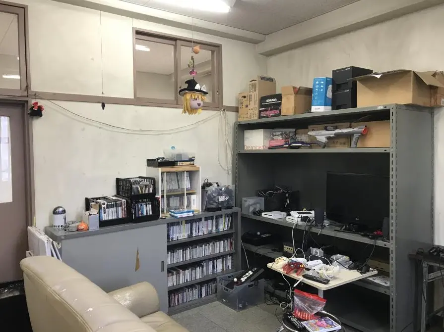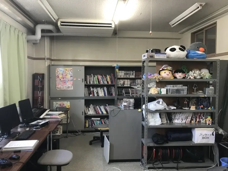 NITMic の部室は、名古屋工業大学の部室棟(55 号館)4 階右手右側にあります。 PC が数台、Kinect や VR ゴーグルといった機材、漫画や参考書、その他いろいろあります。