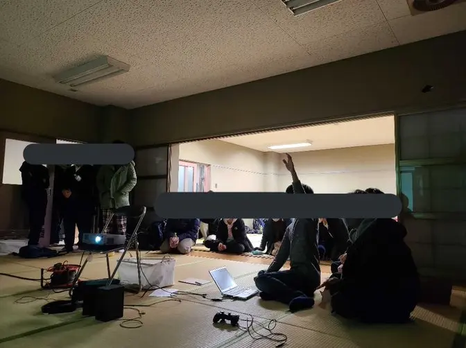 月に一回程度、合宿と呼ばれるイベントを開いています。 合宿と言っても泊まるわけではありません、大学にある御器所合宿所(55 号館 1 階)で金曜の夜に集い、不定期に行われる創作会の発表会や、ゲーム制作のデバック、講座、勉強会、その他などを行っています。